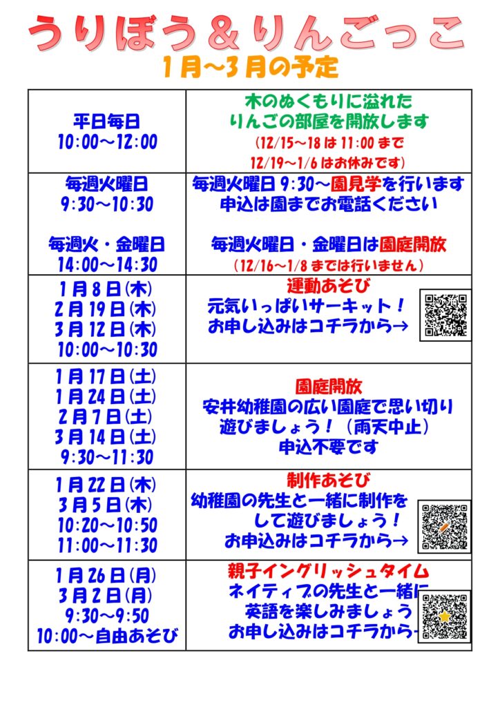 地域の皆様に開かれた幼稚園として、安井幼稚園では未就園のお子様と保護者の皆様のためのプログラム「うりぼう&りんごっこくらぶ」をご用意しております。